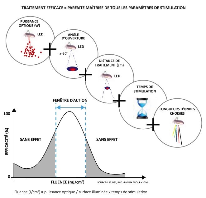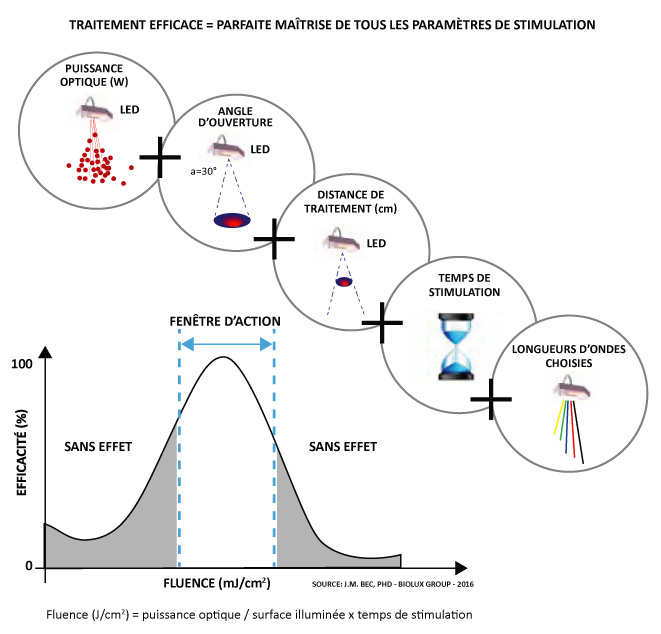Pour obtenir l’effet biologique de la photomodulation il faut utiliser une gamme de doses où les effets seront optimisés ; en dehors de cette gamme, l’effet est réduit voire totalement inhibé : c’est l’effet biphasique.